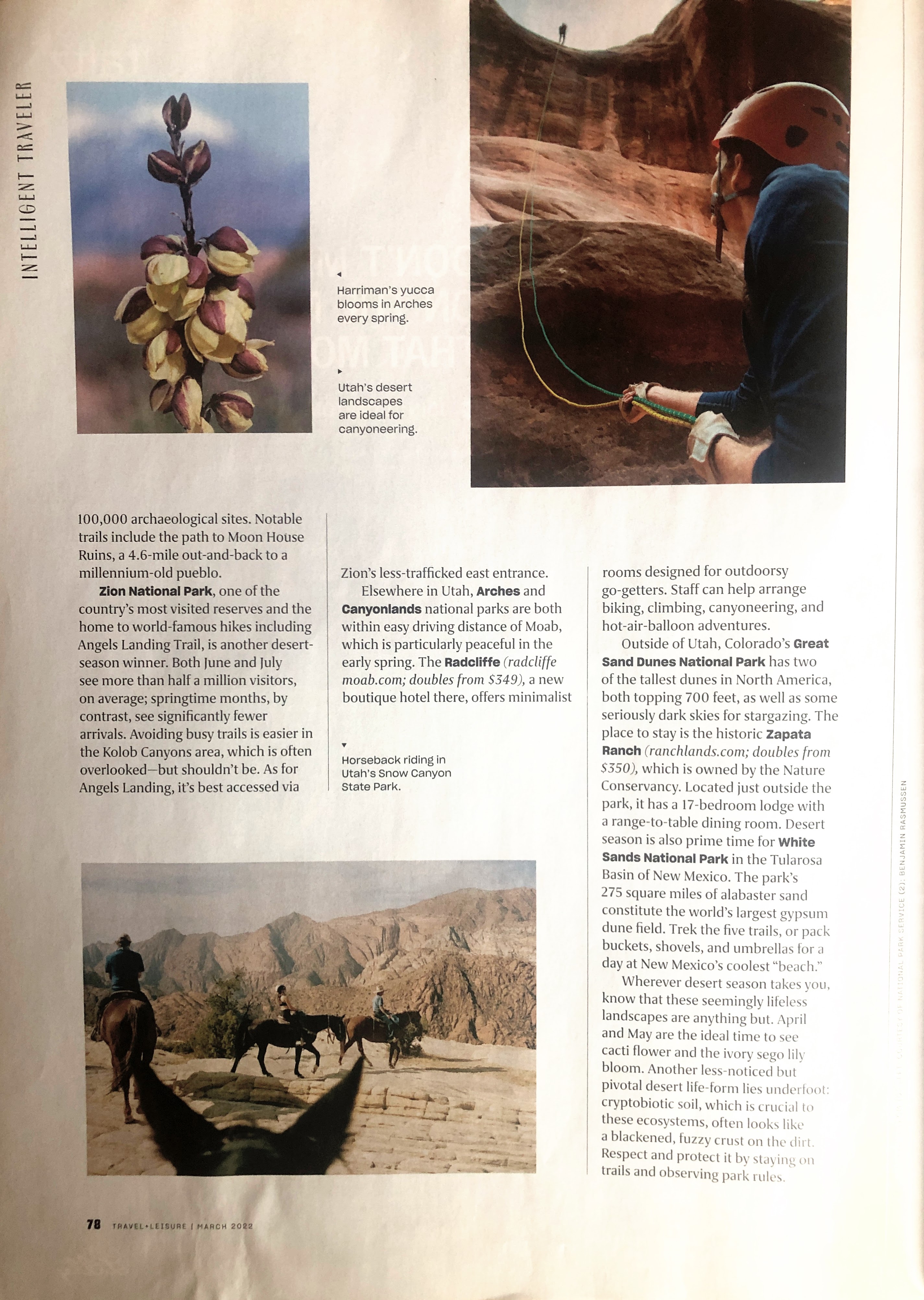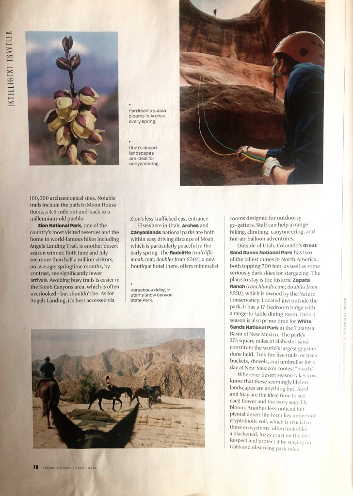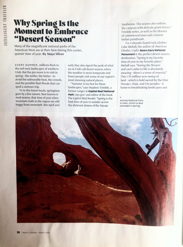 In my second story for Travel + Leisure (March ’22 issue), I interview a couple local legends (writer Stephen Trimble and writer/climber Luke Mehall) about what makes spring in the desert so irresistible. No digital version, so squint below.